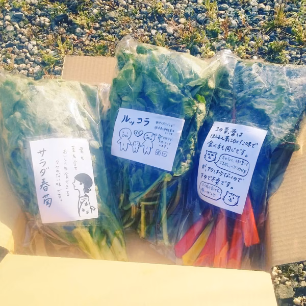 ▼自己紹介 一年を通じて葉物野菜を作っています。愛知県みなか農園の平松です。 平成21年4月に就農してから間も無く12年目の春を迎えようとしています。 当園の野菜はイラストラベル、レシピ付です。 11年間書き溜めたイラストレシピ、ラベルの中で、くっっだらんやつを集めて、クスッと笑っていただけたらと思い、特別にうん子のレシピ集としてプレゼントします。 野菜とうん子を同梱して良いのだろうか…、逡巡し、ネタで終わらせようかと思っていた矢先、ポケマルCEOの高橋様より、「何事もチャレンジ!」「うんこは野菜の元になるから!」とゴーサインを頂きました(^^) こんなえげつないことを普通の売り場でやったら一発アウトと思いますが、懐の広いポケマルさんに感謝しつつ、皆様に微笑を届けられたら幸いです。 一応多少は役に立つ(かもしれない)レシピも入ってますので、何かの機会に役立てていただけたらと思います。 ▼商品概要 サラダ春菊 スイスチャード ルッコラ(の菜花) じゃがいも 葉ネギ(越津ねぎ) の中から三袋のセットです。 恐れ入りますが、野菜の組み合わせのリクエストは出来かねますのでご了承願います。 時期的に品目が少ないので、スイスチャード二袋とサラダ春菊一袋かその逆の組み合わせになる可能性が高いです。ルッコラが採れたら一袋ずつ入れます。 ▼栽培/生産方法、こだわり 島本微生物農法を学び、微生物を使った土作を実践しています。 どの野菜も優しい味で食べやすく、日持ちが良いと好評いただいております。 ▼注文に際しての注意点(配送方法や納期指定など) 大変恐れ入りますが、私一人で農業をやっておりますので、収穫と出荷は週末のみで、日時の指定はできません。 週の頭にご注文頂いた場合は週末までお待ちいただくことになりますのでご了承願います。