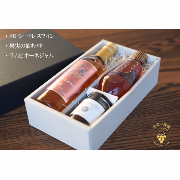 花笑み農園のラム・ピオーネジャム1本とBKシードレスワイン1本と果実の飲む酢ピオーネ1本の詰合せの贈答用です。