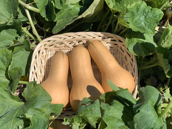 空中栽培で育てたバターナッツカボチャは太陽の光をしっかりと浴び、風通しも良い環境で栽培していますので苗も実もストレスなく元気いっぱいで育ちました。