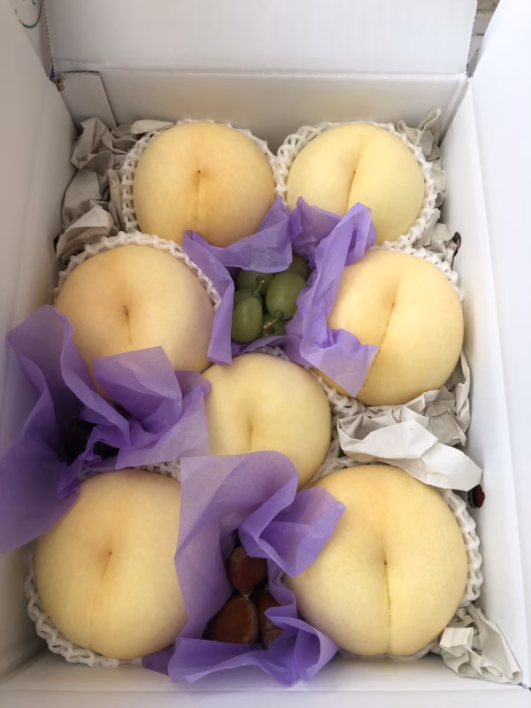 ※JAに出荷する時に一緒に準備します。木で完熟させた桃ではなく、あくまでも市場経由で販売する桃の収穫時期に合わせています。到着時も硬めかと思いますが、店頭では3日程度経過した桃が並ぶ為、いつもより熟度が足りないと感じるかもしれません。その場合はお好みに合わせて追熟して下さい。また桃は日持ちし難い果物ですので追熟の際には十分お気をつけ下さい。