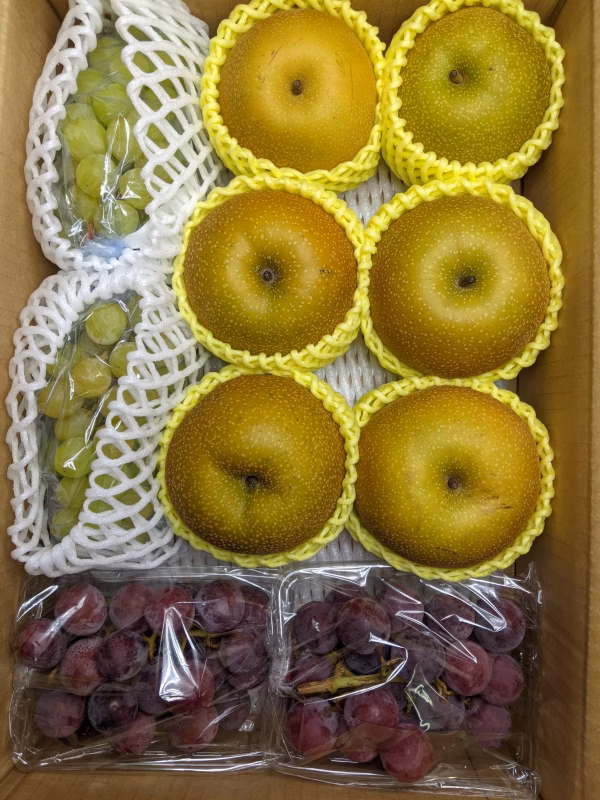 豊水500gサイズ6個、シャインマスカット2房、安芸クイーン2房の詰め合わせです。 ブドウはB級品で約1.5kgです。