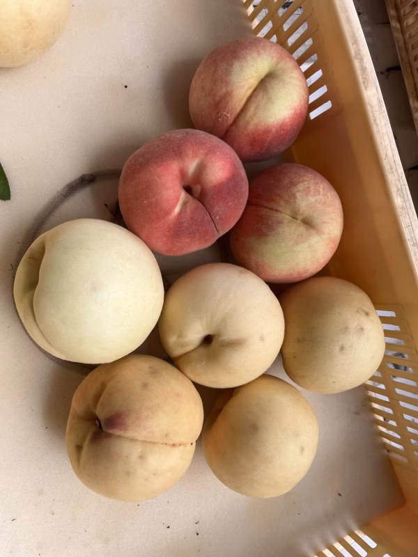 また今日は幸茜のなかなか色が入らなかった桃も収穫しました。こちらも色が入っていなかったり、皮剥け核割れがあったりしますが、カメムシ被害のある甘々燦々よりは日持ちするはずなのでこちらも少し混ぜさせて頂きます。ただ長雨で糖度は目標に辿り着いていませんのでこちらも加工用としてお使い下さい。