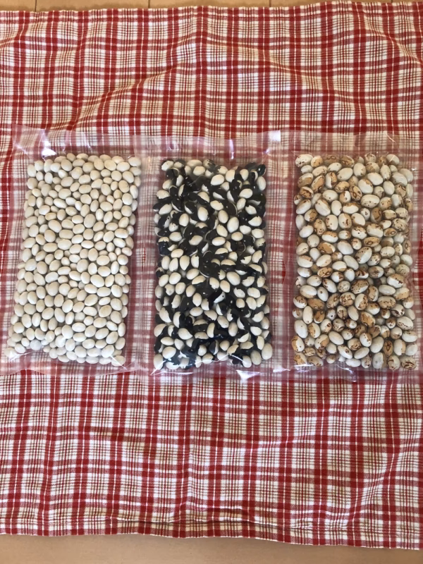 インゲン豆3種類の食べ比べセットです。昨年は一昨年の収穫が少なくて出品出来なかったとら豆を今年は出品できます。