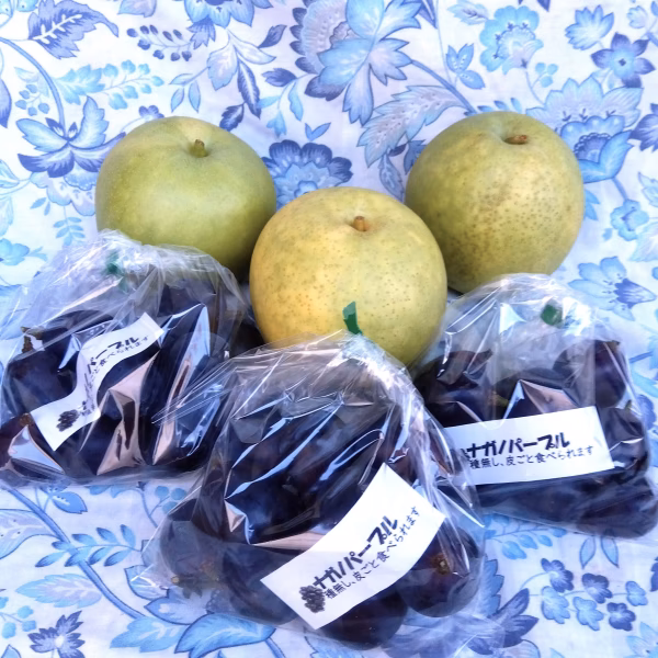 ご自宅用ナガノパープル粒袋入り3袋と梨3個