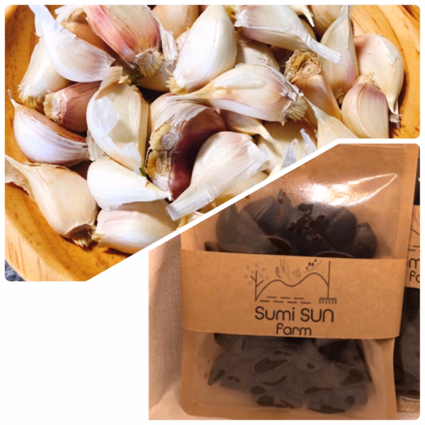 新春、お年玉キャンペーン!! 30%増量中です!! (※シーズン最終、売り切れ次第終了※) Sumi SUN farmは青森県黒石市の標高400mにある自然豊かな農村で「農薬・化学肥料・除草剤を使わない」「栽培中のプラスチックゴミ削減のためビニールマルチを使わない」こだわりの栽培方法で生産しております。 手間をたくさんかけて、日々自然と格闘してます。 まだまだ思ったような栽培ができず自問自答中の新米農家です。 ”にんにく白・黒セットはバラにんにくと自家製黒にんにくをセットにした商品です” 当園のにんにくは準高冷地の涼しい環境で育ったため小ぶりですが、にんにくの風味はしっかりありつつも、しつこくにんにく臭が残らない食べやすいにんにくです。 すりおろして、きざんで、焼いて、揚げて! 何でも来いな美味しさです! ・にんにく 品種:ホワイト6片種 260g(バラ・サイズ無選別) ・黒にんにく 130g(100g入りパック・1個) または260g(130g入りパック・2個) Sumi SUN farmの自家製黒にんにくは 【1粒づつ丁寧に薄皮を取ることで、より手軽に食べやすくなりました! さらに、皮が無くなった分既存商品より内容量10%UPでお得に!! さらにさらに、パッケージも便利なチャック付きパックで持ち歩きに、ギフトに匂いを気にせず色んな場面でご活用ください。】 常温で発送いたします。 ※黒にんにくは1回の生産量に限りがあるため、タイミングによっては発送までにお時間をいただく場合がございます。また、発送時の"日時指定"は受け付けておりません。ご了承くださいませ。