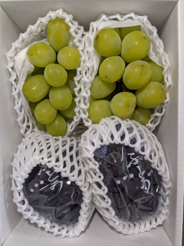 雄宝約500g2房とピオーネ約400g2房800gの食べ比べ詰め合わせです。 なお、家庭用としての出品で箱はぶどう箱を再利用しております。