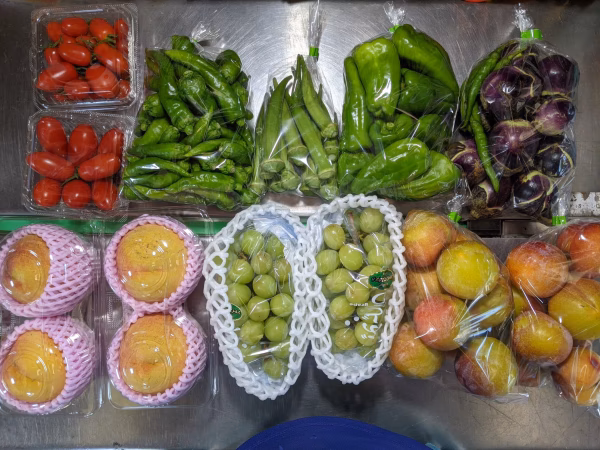 アイコ、アマトウガラシ、オクラ、丸ナス、ピーマン、桃、スモモ、ブドウ