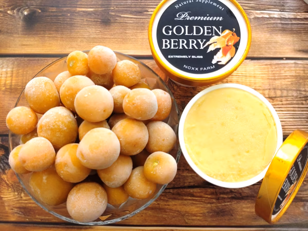 ネクスファームで収穫したゴールデンベリーを冷凍したフローズンゴールデンベリーとゴールデンベリープレミアムアイスをセットでお届けいたします!