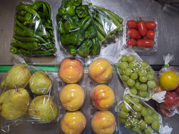アイコ200g、アマトウガラシ400g、オクラ200g、ピーマン400g、桃1.6kg、スモモ800g、ブドウ700g、洋ナシ1.4kgの詰め合わせです。