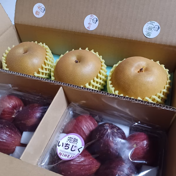 - 梨はビニールに入れて冷蔵、イチジクも冷蔵。もしくはお腹にすぐ!