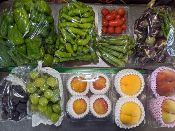 アイコ200g、オクラ200g、シシトウ600g、丸ナス900g、ピーマン1kg、桃1.5kg、スモモ500g、ブドウ1.1kgの詰め合わせです。