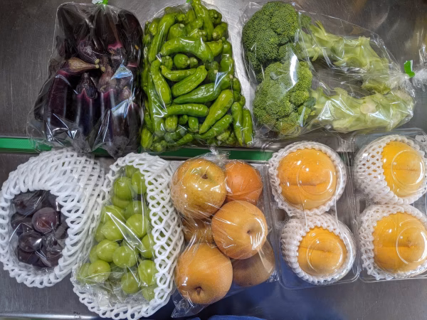 シシトウ600g、ブロッコリー700g、ナス800g、桃1.2kg、梨1.2kg、ブドウ1.2kgの詰め合わせです。