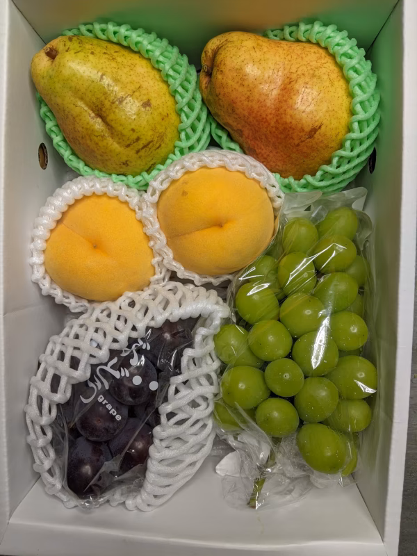 桃400gと洋梨700gとブドウ1kgの詰め合わせです。