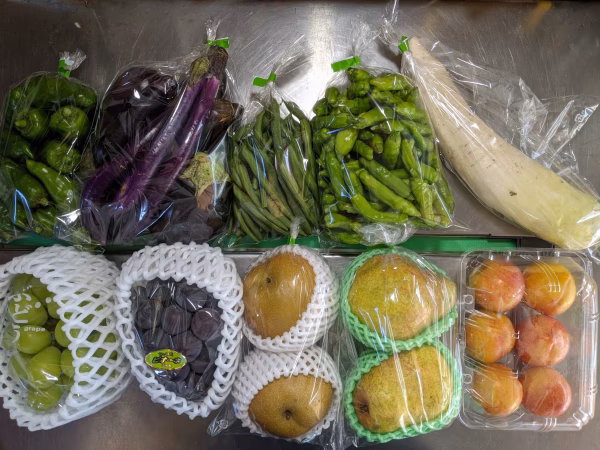 インゲン200g、シシトウ300g、ダイコン500g、ナス700g、ピーマン250g、スモモ500g、洋梨700g、梨600g、ブドウ900gの詰め合わせです。