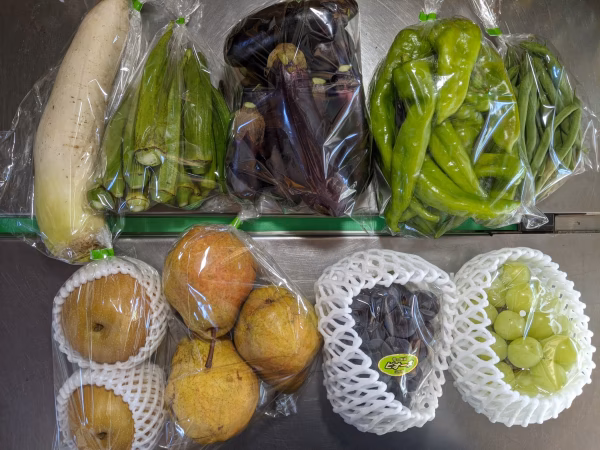 アマトウガラシ500g、インゲン200g、オクラ350g、ダイコン500g、ナス800g、梨600g、洋梨1kg、ブドウ800gの詰め合わせです。