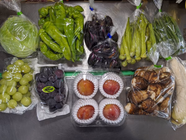 アマトウガラシ500g、インゲン200g、オクラ300g、キャベツ500g、小茄子400g、サトイモ1kg、ダイコン400g、ブドウ1kg、スモモ600gの詰め合わせです。 果物はシャインマスカット、ピオーネ、秋姫です。 家庭用お楽しみボックスです。