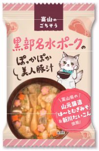 富山県産のはと麦、大豆を使用した山元醸造のお味噌「は~とむぎみそ」を使用。ミネラルを豊富に含んだ、黒部川の伏流水で育った黒部名水ポーク、JAうおづの美人だいこんと呼ばれる「新川だいこん」を入れた、やわらかい風味の豚汁です。