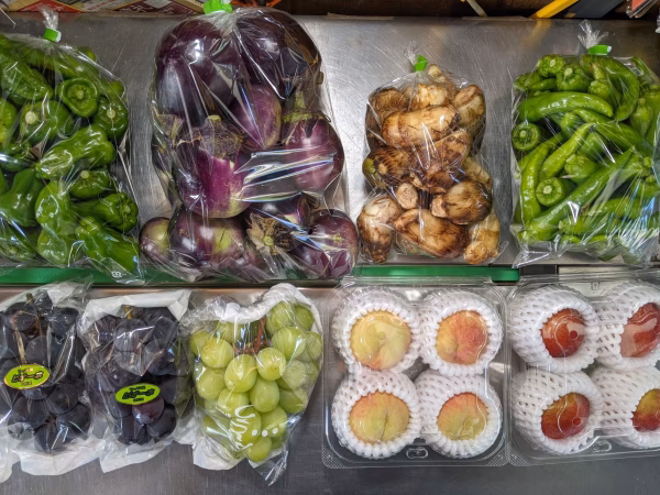 アマトウガラシ600g、サトイモ800g、丸ナスサイズ混合1.7kg、ピーマン600g、ブドウ1.2kg、桃500g、スモモ500gの詰め合わせです。 ブドウはシャインマスカット1房とピオーネ2房です。 桃はきららのきわみ4個で500g、スモモは秋姫4個で500gです。 家庭用お楽しみボックスです。