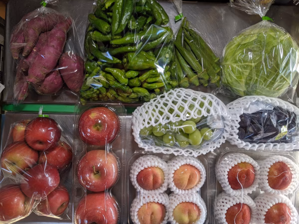 オクラ200g、サツマイモ900g、キャベツ900g、ピーマンナンバン類ミックス1kg、リンゴ1.9kg、桃600g、スモモ700gの詰め合わせです。