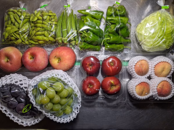 枝豆600g、オクラ200g、キャベツ600g、ピーマン400g、リンゴ1.6kg、桃600g、ブドウ1.1kgの詰め合わせです。 リンゴは涼香の季節3玉と紅玉4玉です。 桃はきららのきわみ4玉です。 ブドウはシャインマスカット1房とピオーネ1房です。 家庭用お楽しみボックスです。