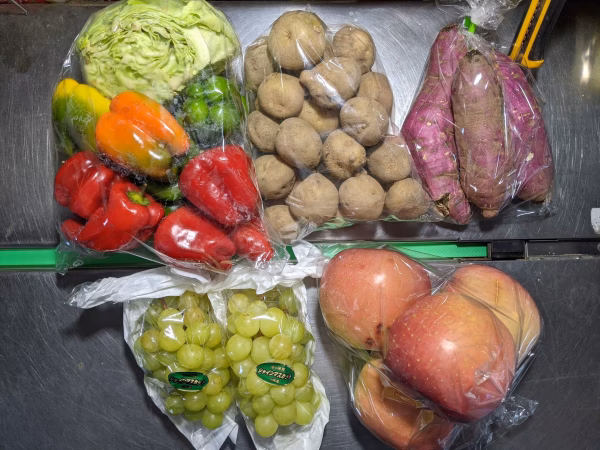 リンゴ1.5kg、ブドウ600g、キャベツとカラーピーマン1.2kg、サツマイモ800g、ジャガイモ1.2kgの詰め合わせです。