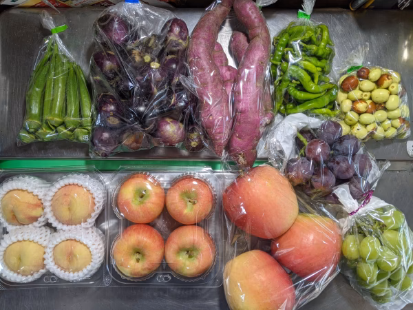 オクラ200g、サツマイモ1kg、丸ナス1kg、ナンバン200g、桃600g、リンゴ2.1kg、ブドウ1kg、ナツメ250gの詰め合わせです。