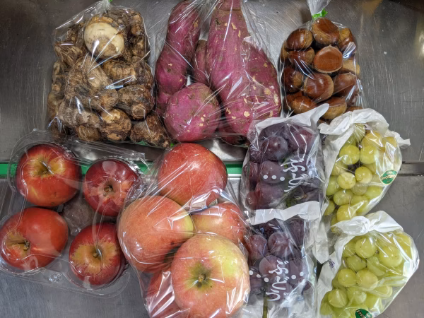 サツマイモ1.2kg、サトイモ1kg、クリ500g、リンゴ2.3kg、ブドウ1.5kgの詰め合わせです。 リンゴは紅玉4玉と千秋の袋詰めです。 ブドウはシャインマスカット2房とピオーネ2房です。 家庭用お楽しみボックスです。 なお、複数出品のためそれぞれの重量や形状には差異がございますのでご了承下さい。