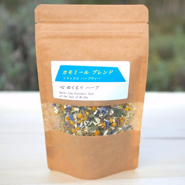 - 名 称:カモミールブレンド ~ リラックス 原材料名:カモミール、ラマトゥルシー、ミント レモンタイム、コーンフラワー 製 造 者:岐阜県恵那市山岡町馬場山田465-2 西森裕記 賞味期限:1年