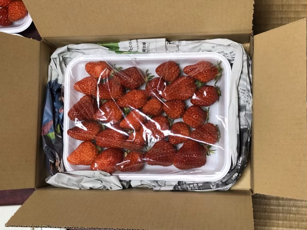 市販の食品トレイパックにイチゴを並べた方法でのお届けです。