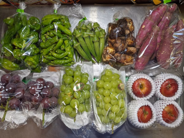 オクラ200g、シシトウ300g、サツマイモ1kg、サトイモ500g、ピーマン400g、ブドウ1.6kg、リンゴ600gの詰め合わせです。