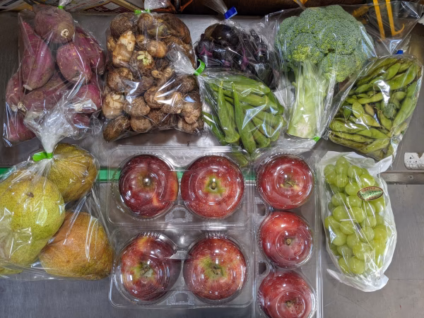 エダマメ300g、オクラ250g、サツマイモ1kg、サトイモ1kg、小茄子200g、ブロッコリー400g、洋なし1.9kg、リンゴ2.1kg、ブドウ450gの詰め合わせです。