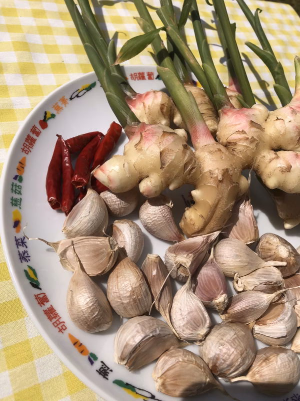 新ショウガ 300g にんにく 300g、赤唐辛子 数本、香辛料(ハーブなど) 1種類~2種類 香辛料の内容はその時の畑の状態で変わります。