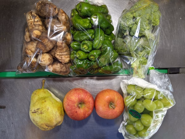 サトイモ1kg、ブロッコリー400g、ピーマン500g、シャインマスカット600g、バラード500g、千秋600gの詰め合わせです。