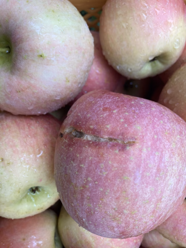 キズやスレ、軸割れ、色むら、大きさバラバラ、色付きが良くないなどですが、めっちゃ美味いりんごです。