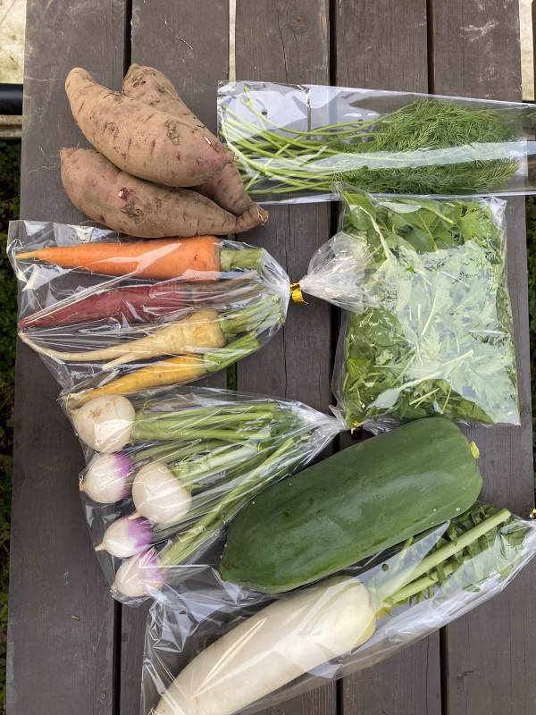 その他サツマイモ、ジャガイモ、ピーマン、カラフル人参、大根、カブ、ビーツ、山芋、ベビーリーフ、ディル、春菊、ビーツ、柿、みかん