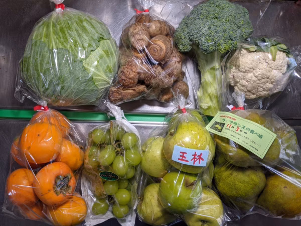 カリフラワー400g、キャベツ800g、サトイモ800g、ブロッコリー500g、ラ・フランス1.8kg、リンゴ1.5kg、柿1.2kg、ブドウ500gの詰め合わせです。 ラ・フランスは追熟中ですので、お好みの柔らかさでお召し上がり下さい。柿は渋抜き済みです。リンゴは王林です。 家庭用お楽しみボックスです。なお、複数出品のためそれぞれの重量や形状には差異がございますのでご了承下さい。また、経費削減のため出荷箱を再利用しております。