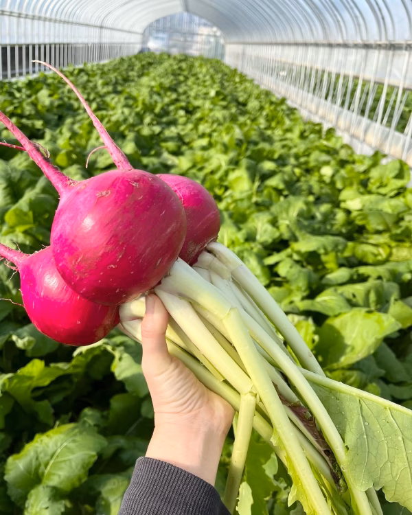 外側の赤い部分はピリリと辛いのですが、中の部分は白色の中にほんのりピンクがかって、見た目がまるで桃🍑のようなかぶなんです!
