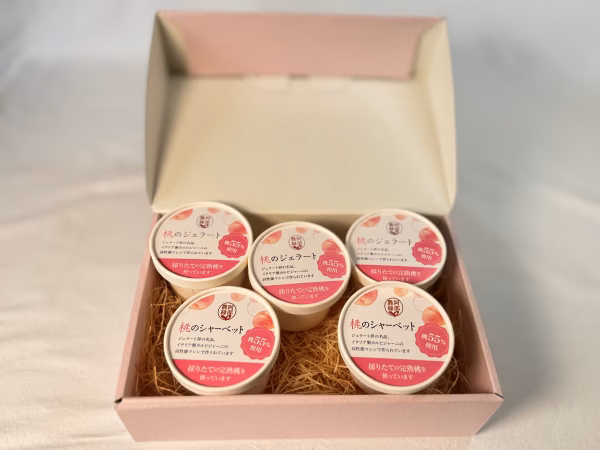 - ・原材料名 桃のジェラート 120ml×3個 桃(福島県須賀川市産)、牛乳、乳製品、砂糖、ブドウ糖/トレハロース、 安定剤、酸化防止剤、クエン酸(一部に乳製品を含む) 桃のシャーベット 120ml×2個 桃(福島県須賀川市産)、牛乳、砂糖、ブドウ糖/トレハロース、 安定剤(増粘多糖類)酸味料(一部に乳製品を含む)