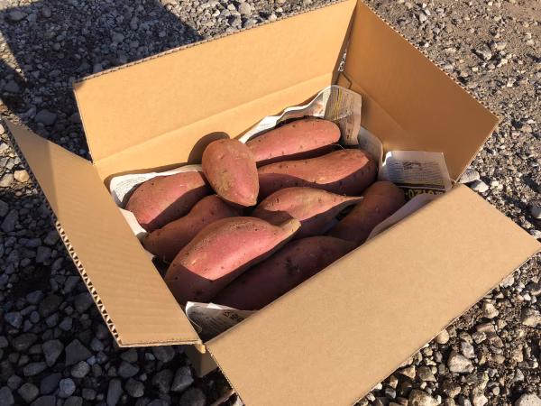11月上旬に収穫したサツマイモです。比較的早めに甘くなる品種ですが、まだ寝かせることで甘くなります。調理に利用する場合は、ほくほく感がまだあり、サイズも大きいため使いやすいと思います。