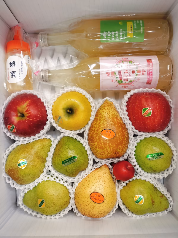 りんご、洋梨、りんごジュース、洋梨ジュース、蜂蜜が入った欲張りなセットです。贅沢の極みですね。