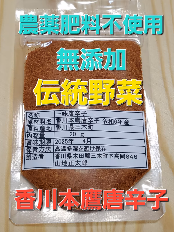 の畑で育った自家採取6年目の香川本鷹を乾燥して一味にしました。