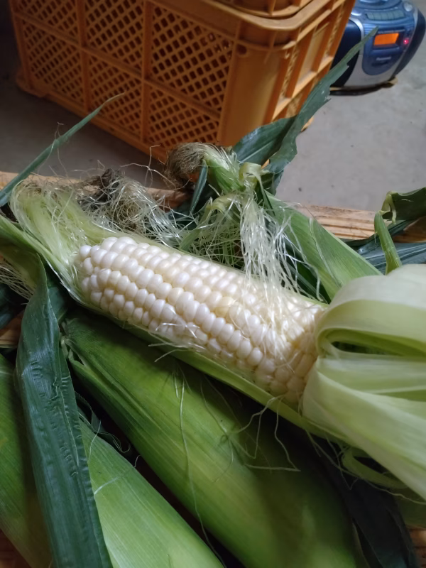 ホワイト系スイートコーン【品種名:ホワイトショコラ】 粒皮は柔らかく爽やかでかつフルーティー ガツンとした甘みはありませんが爽やかな甘みです 低温ストレスで少し黄色っぽくなっています 一箱約5kg 15本ほど 発送予定日に収穫したものを箱詰めいたしますのでサイズはM〜2Lが混ざっています クール便で発送いたします ※参考糖度   11/12 17度  11/13 15度  糖度にはバラツキがあります