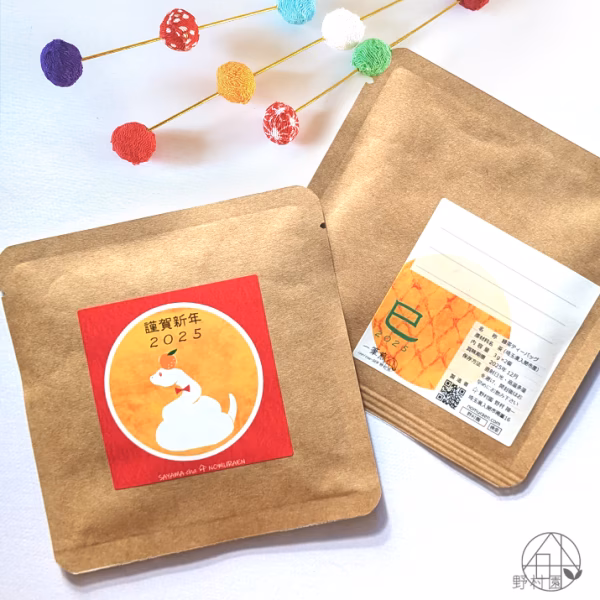 限定!お茶のお年賀プチギフト🎍 1袋にティーバッグ2個入り。 10袋からの販売です。 お茶は「緑茶・紅茶・焙じ茶」から 組み合わせ自由にお選びいただけます♪ ====== 温かみのあるクラフト地に 野村園オリジナルの巳年デザイン♡ 裏面にはメッセージを書ける罫線があるので 《美味しく飲めるメッセージカード》 としてもご利用いただけます。 いつもお世話になっている方々へ そのまま気軽にお渡ししたり、お年賀の品に添えても。 年始のご挨拶プチギフト、お店のノベルティにも! 様々なシーンで “美味しくかわいく” 活躍します♪ ====== ◆ご注文方法◆ 画像をご参照ください 以下の内容を、メッセージまたは申し送り事項にて必ずご連絡ください。 (コピー&ペーストし、書き換えてご利用ください) ◆お茶の種類  ① 緑茶のみ  ② 紅茶のみ  ③ 焙じ茶のみ  ④ お好きな組み合わせ☆ ☆④を選んだ場合には、その内訳を入力ください ====== 表示分量外のご注文も承ります!(1袋:210円) 宅急便での配送。送料は配送先によって異なります。 (一万円以上で送料無料/大量注文も可能です) 「お客様専用ページ」での対応となります。 数量をお書き添えの上、お気軽にお問合せくださいませ! ====== 自園で大切に育てた茶葉を100%使用。 農家 “手づくり・直送” のこだわりティーバッグです。 心がじんわり温まる癒しのプチギフト、 ひとつひとつ丁寧に作成してお届けします。 △▽△▽△▽△▽△▽△▽ 原材料名:茶(埼玉県入間市産) 内容量 :ティーバッグ2コ/袋 賞味期限:(緑茶・焙じ茶)製造日より1年間、(紅茶)製造日より2年間 △▽△▽△▽△▽△▽△▽
