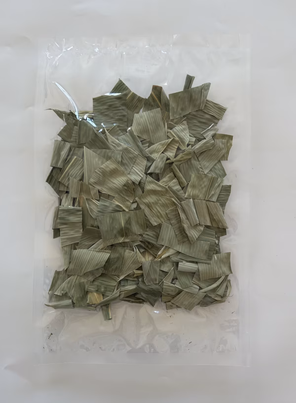 手摘み採取後、流水洗浄→天日干し→食品乾燥機にて乾燥させたクマザサを1〜2センチ幅でカットしました。