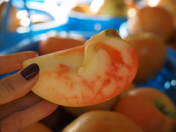 果肉が赤いりんごムーンルージュは、長野県中野市で、吉家さんという個人育種家が30年以上かけ開発しました。2018年に品種登録されたばかりで、長野県内でもほとんど流通していない超希少品種です。