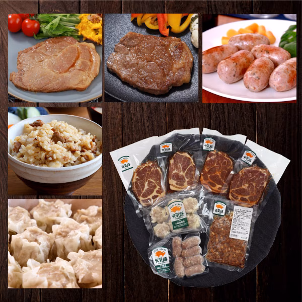 お送りするセット内容は、肩ローストンテキ、肩ローストンテキ(BBQソース味)、ヒレ肉の味噌漬、粗挽きハーブフランク、炙り焼豚ご飯の素、大粒肉焼売の詰め合わせになります。