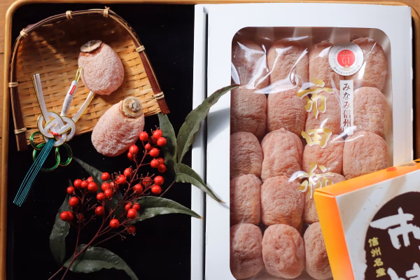 じっくりと南信州特有の霧の多い気候を利用し丁寧に1ヶ月以上かけて干しあげ、寝せこみ、粉だし作業をしておりますので、表面に柿内部から染み出した糖分がきめ細かい結晶となって表面にまといます。