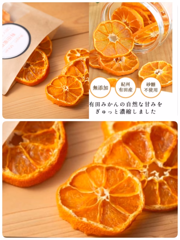 今年まで木に成らして収穫した、越冬早生みかんを輪切りにし、砂糖不使用ですので、そのままをパリパリ食べたり、ヨーグルトや、紅茶に浮かべたり、サラダの演出に、是非お使い下さいませ。