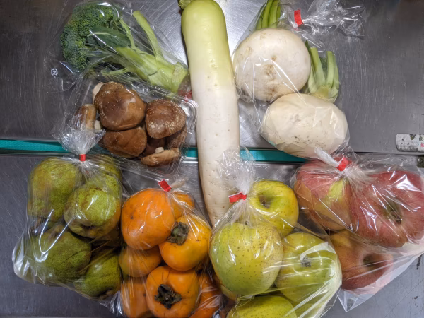 カブ1.1kg、ダイコン900g、ブロッコリー300g、シイタケ200g、リンゴ3.6kg、柿1.2kg、ラ・フランス1.4kgの詰め合わせです。