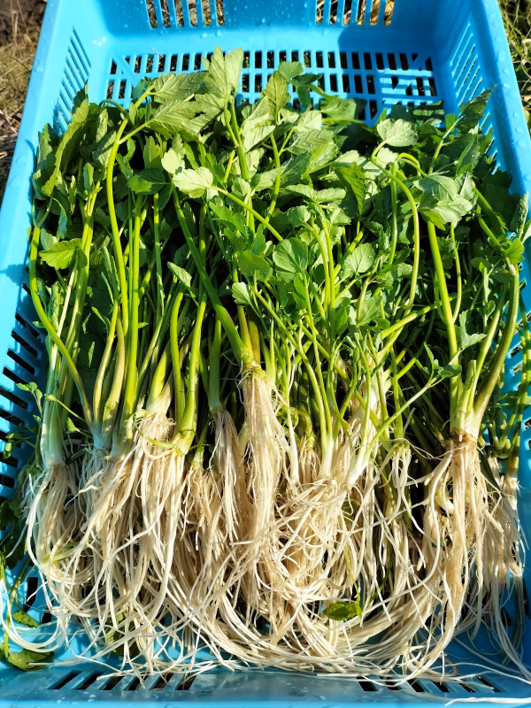 #栽培:ヒョロっと細長い水耕栽培の物に比べて、土耕栽培なので力強い茎と葉をしています。セリ本来の強い香り、ギシッとした歯応え、深い味わいを楽しめます。根付きです。是非一度、ご賞味下さい。